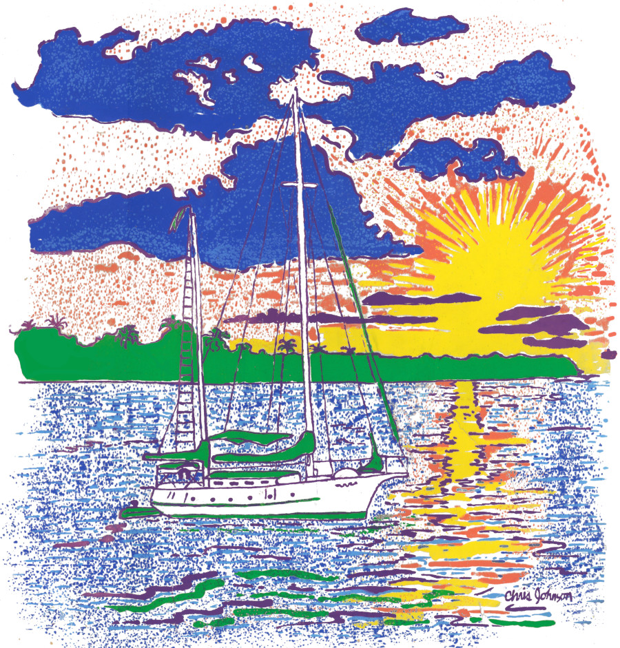 Ketch Sailboat at Sunset – Inspired from one of the most exotic places around the world, this scene from Roatan, Honduras. The sunset from a ketch rigged sailboat is a magnificent display of beauty on the Caribbean Gulf Coast ocean.