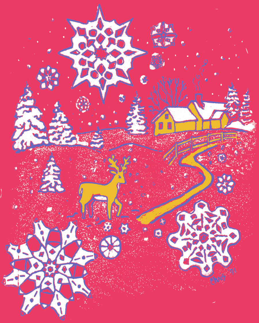 Winter Snow in Wonderland – Snow flakes fall in a winter wonderland as a reindeer stands tall in the foreground. The farm house is in the distance just down the country lane. We know it is warm and cozy there. Winter snow is in the air. A shirt you can wear every year in the Christmas Holiday season.