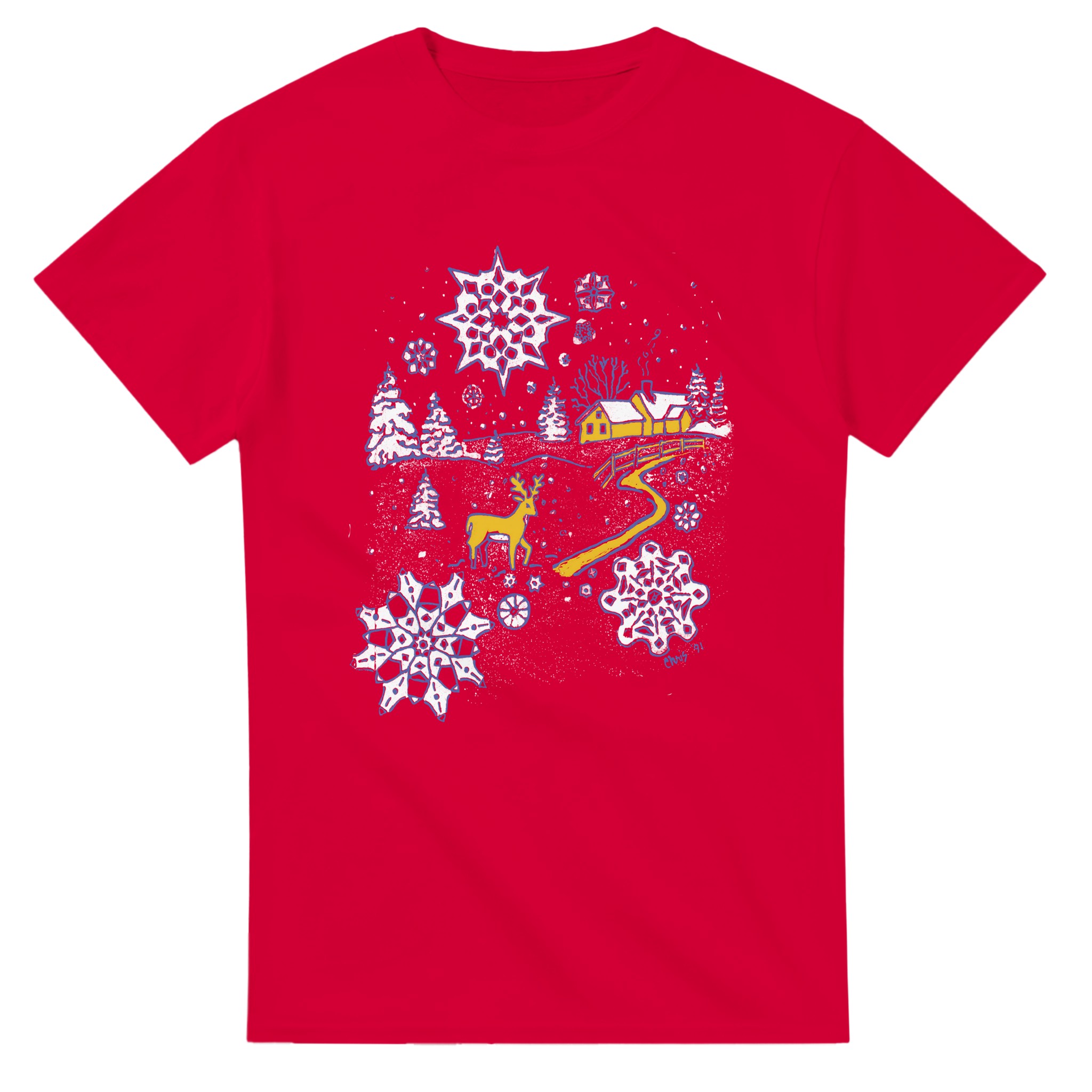 Snow flakes fall in a winter wonderland as a reindeer stands tall in the foreground. The farm house is in the distance just down the country lane. We know it is warm and cozy there. Christmas snow is in the air. Christmas shirt you will wear every year in the season.
